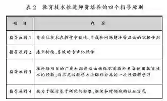 2017 NETP对教师的培养也进行了反思,认为教师需要对如何使用技术来支持学习有深刻的理解。有效地使用技术,并非指教师在教学中随意地加入技术或技能,而是指教师需要明白如何使用技术去实现学习过程中每一个阶段的学习目标。2017 NETP针对师资培养过程中如何推进教育技术,给出了四个指导原则,如表2所示: