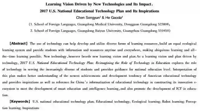 关键词:美国国家教育技术计划;教育技术;生态学习;机器人学习;知觉学习;启示
