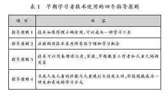 在对早期教育技术使用的关注层面,2016年10月发布的《早期教育与教育技术政策简报》阐述了一种技术支持学习的愿景,包括所有青少年在他们不同年龄阶段的学习过程中,都能从熟悉如何使用技术来辅助学习的大人那里获得支持;所有青少年都将有机会通过多种途径进行学习、探索、玩耍和交流,其中包括技术的使用。该《简报》为早期学习者提供了四个技术使用的指导原则,具体如表1所示: