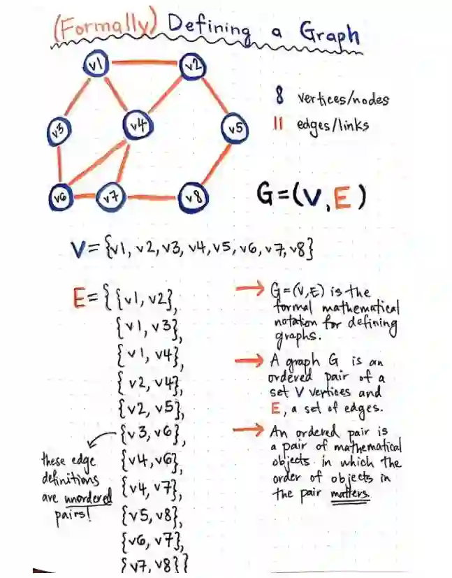 在数学术语中,我们将图描述为有序对(ordered pairs)。还记得以前学过的函数,它的定义就是在二维坐标轴上分布的有序对(x,y)集合。图也是使用类似的定义,只不过使用图的结点(vertices)v 和边(edges)e 代替 x 和 y。