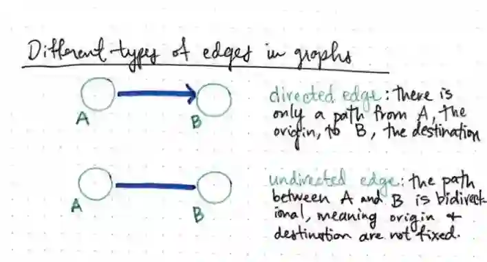 不同类型的边或路径对定义和识别图时非常重要。边的类型实际上是图之间最大、最明显的区别之一。大多数情况下(只有一种例外),图会有两种类型的边:即具有方向或流向的边和不具有方向或流动的边。我们将其称为有向边(directed edges)和无向边(undirected edges)。