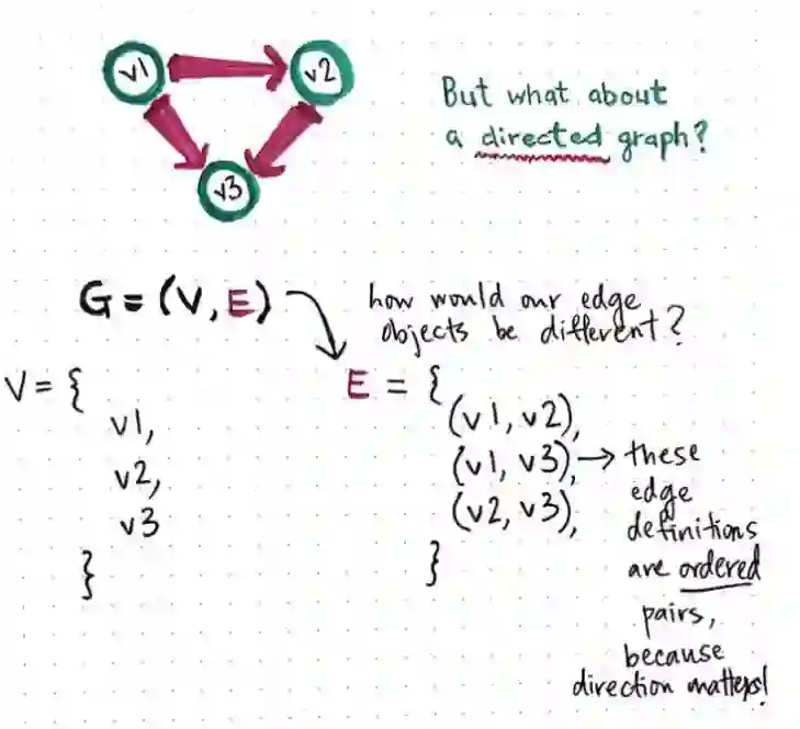 在有向图中,定义结点的方式和无向图中是一样的,但有向边和无向边的定义是不一样的。在有向图中,边的对象定义为有序对(使用圆括弧表示),因为这种情况下,边的方向十分重要。因为在有向图中,边只能是从起始结点到目标结点,所以边必须进行排序,从而定义 E 中有序对前一个元素为起始结点,后一个元素为目标结点。