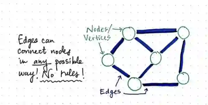 在图中,结点和结点之间的连接并没有确切的规则,边(有时候也称为链接)能以任何方式连接结点。