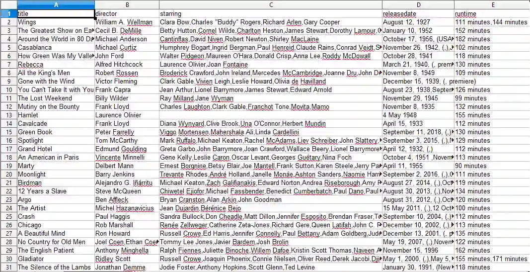 例如,假设您希望编制一份获得奥斯卡最佳影片的影片名单,以及他们的导演,主演演员,发行日期和上映时间。使用Google,您可以看到几个列出这些电影名称的网站,也许还会有一些其他信息,但通常您必须通过链接来获取所需的所有信息。