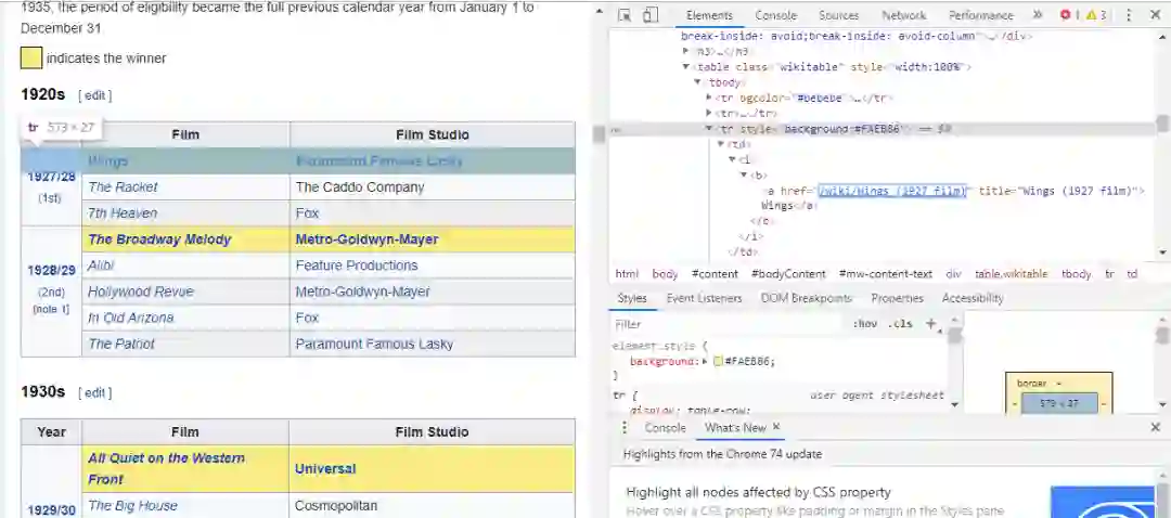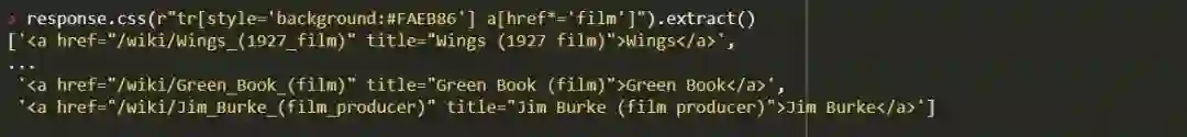 正如你所看到的,奥斯卡获奖者有黄色背景,而被提名者只有一个简单的背景。这还有关于电影标题的文章的链接,以及以film)为结束标记的电影链接。现在我们知道了这一点,我们可以使用CSS选择器来获取数据。在Scrapy shell中,输入: