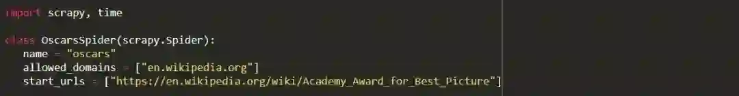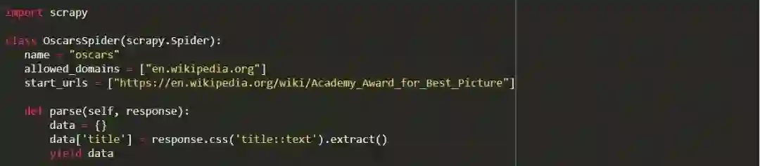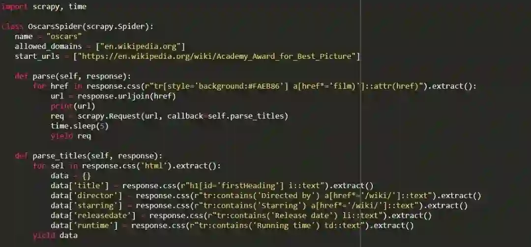 我们将从一个基本的蜘蛛开始。将以下代码输入到python脚本中。在文件夹/oscars/spiders中新建一个新的python脚本并命名为oscars_spider.py