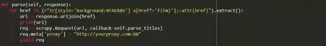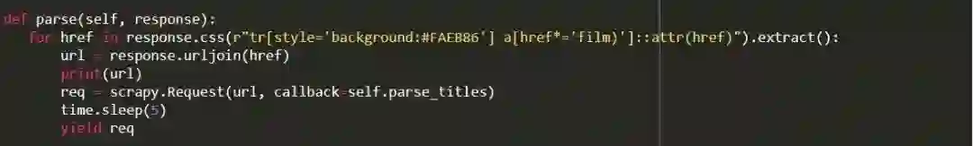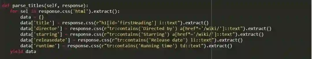在这里,我们创建一个循环来查找页面中每一个以film)结尾、带有黄色背景的链接,然后我们将这些链接一起加入到URL列表中,我们将其发送到parse_titles函数以进一步传递。我们也会在计时器中输入它,每5秒钟只能请求一次页面。请记住,我们可以使用Scrapy shell来测试我们的response.css字段,以确保我们获得正确的数据!