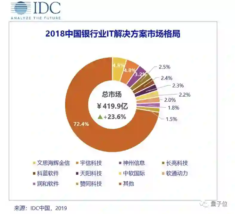 最新一份可参考报告来自于IDC,其在2019年7月份发布《中国银行业IT解决方案市场份额》报告显示,2018年宇信科技市场份额为4.8%,与市场份额第一名文思海辉,差别仅有0.1%。