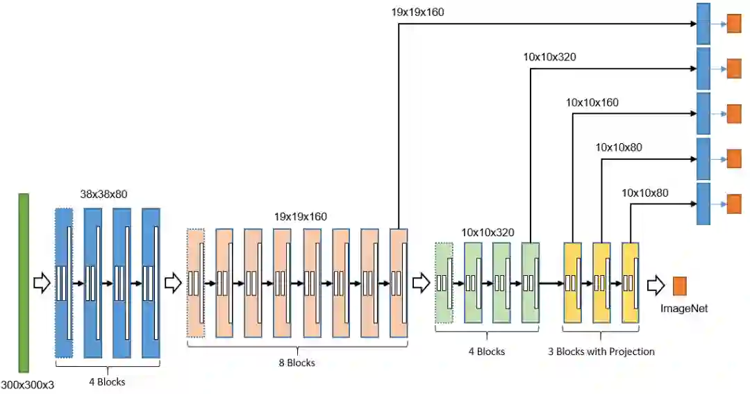 我们以SSD框架为基础,构造了短小精干的二维码检测器(见图1),采用残差连接(Residual Concat)、深度卷积(Depthwise Convolution)、空洞卷积(Dilated Convolution)、卷积投影(Convolution Projection)等技术进行了针对性的优化。