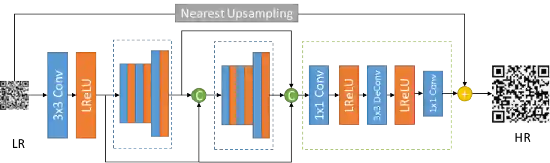在网络结构上,密集连接(Dense Concat)、深度卷积(Depthwise Convolution)、反向卷积(Deconvolution)、残差学习(Residual Learning)等技术改善模型的性能;在目标函数上,针对二维码强边缘和二值化的特点,结合L2/L1损失、边界加权、二值约束设计了针对二维码的目标函数。