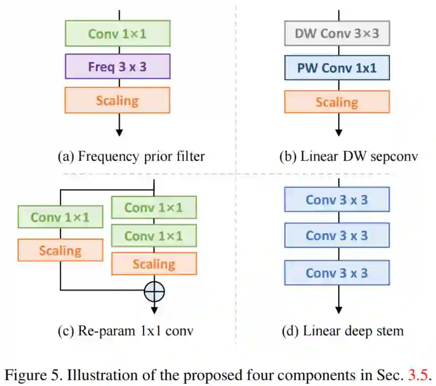 添加了一个频率先验滤波器和一个线性的深度可分离卷积 将所有的Stem(即最初的7×7卷积)替换为所提出的线性deep stem层 在bottleneck中,除了1和2之外,进一步将所提出的rep 1×1块替换原来的1×1卷积分支
