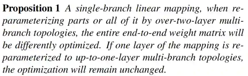 命题1:一个单分支线性映射,当通过超两层多分支拓扑重参化部分或全部时,整个端到端权重矩阵将得到不同的优化。如果映射的一层被重参化到多达一层的多分支拓扑,则优化将保持不变。