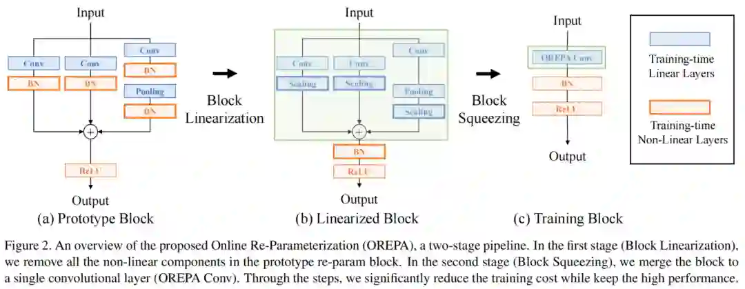 基于观察结果,作者提出了在线重参化(OREPA)(图1(c)),这是一个两阶段的pipeline,使之能够简化复杂的training-time re-param block。