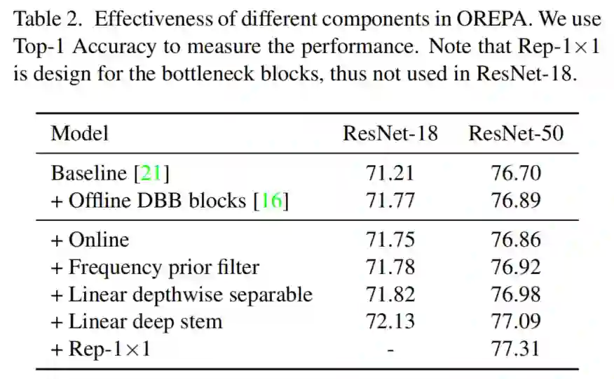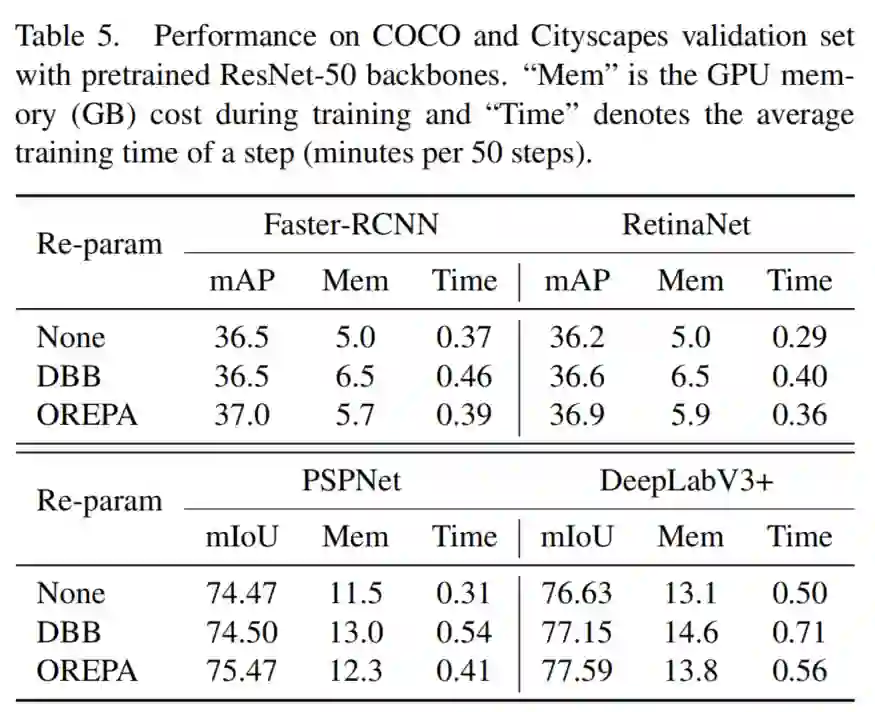 training-time block压缩成单个卷积来减少巨大的训练开销。为了实现这一目标,本文引入了一个线性缩放层,以更好地优化在线块。在降低训练成本的帮助下,作者还探索了一些更有效的重参组件。与最先进的重参模型相比,OREPA能够节省约70%的training-time成本,并加速训练速度约2×。同时,配备OREPA,模型在ImageNet上的方法高出+0.6%。作者还进行了目标检测和语义分割的实验,并显示了对下游任务的一致改进。