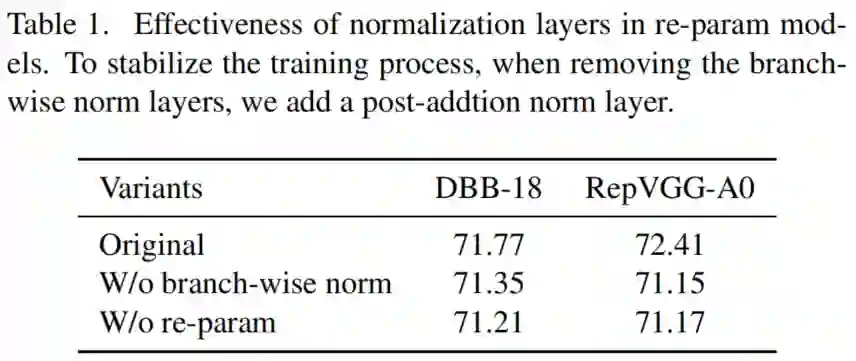 作者认为中间BN层是重参化过程中多层和多分支结构的关键组成部分。以SoTA模型DBB和RepVGG为例,去除这些层会导致严重的性能下降,如表1所示。