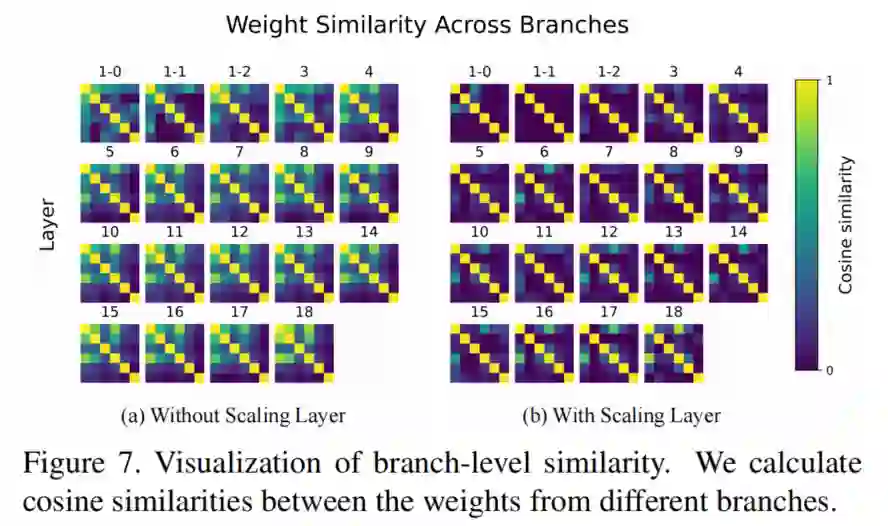 首先进行实验来验证核心思想,即所提出的线性缩放层与BN层起着相似的作用。根据3.4中的分析。文章展示了缩放层和BN层都能够多样化优化方向。为了验证这一点,作者可视化了图7中所有分支的分支级相似性。作者发现,缩放层的使用可以显著增加不同分支的多样性。