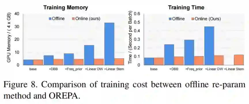 作者比较了OREPA-ResNet-18与DBB-18的训练成本进行了对比。举例说明了消耗的内存(图8(a))和训练时间(图8(b))。