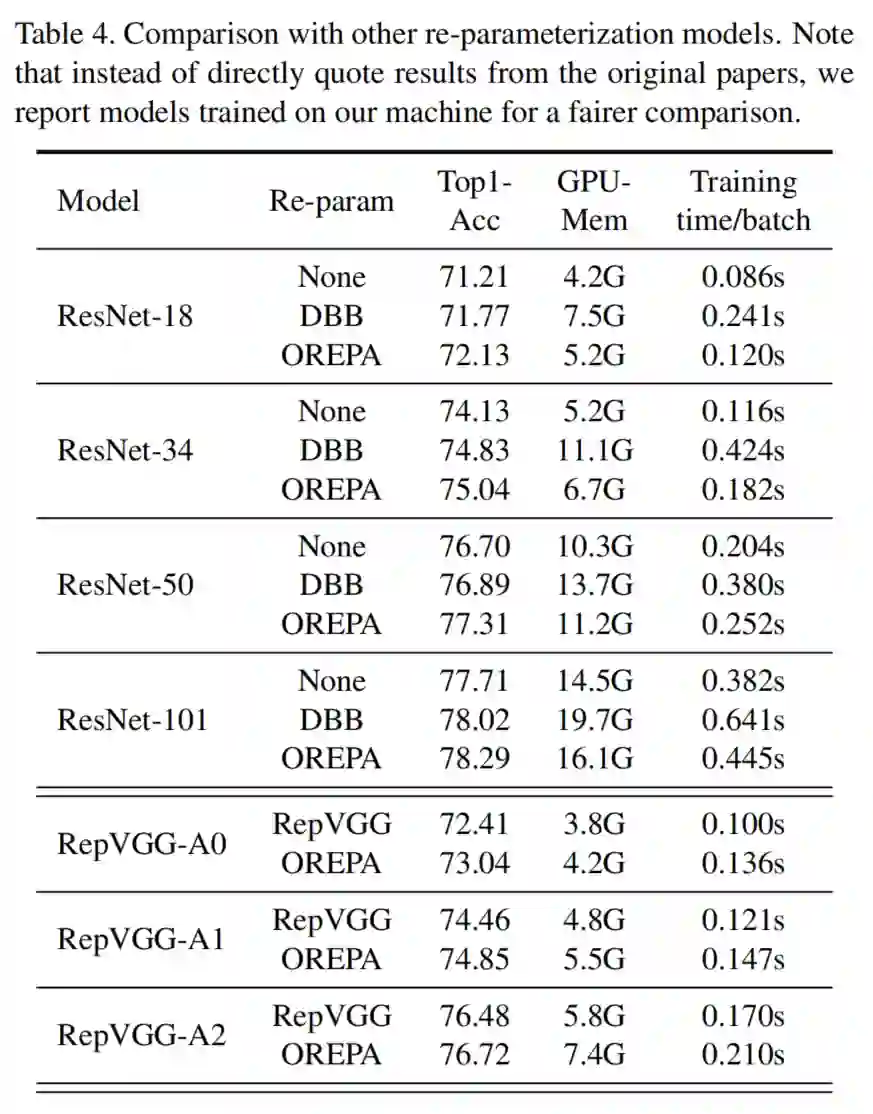 从表4中观察到在ResNet系列上,OREPA可以在各种模型上的性能持续提高+0.36%。同时,它将训练速度加速了1.5×至2.3×,并节省了约70+%的额外训练时间内存。
