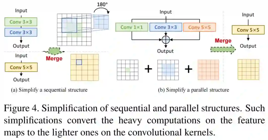 简化为单一卷积,就可以压缩一个块。在下面的部分中,将展示如何简化顺序结构(图4(a))和并行结构(图4(b))。