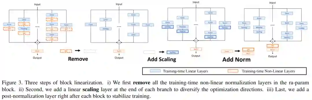 在第一阶段,block linearization,去除所有的非线性BN层,并引入线性缩放层。这些层与BN层具有相似的性质,因此它们使不同分支的优化多样化。此外,这些层都是线性的,可以在训练过程中合并成卷积层。