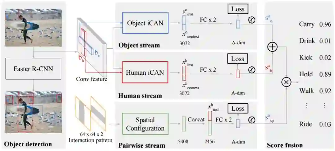 图3:模型概述。研究者提出的模型包括以下三个主要流:(1)基于人类外观检测交互的人流; (2)基于物体外观预测交互的物体流;(3)用于编码人类和物体边界框之间的空间布局的配对流。基于现有的 Faster R-CNN 检测到的对象实例,使用所有的人 - 物体对生成 HOI 假设。然后融合来自各个流的动作分数以产生最终预测,如右图所示。