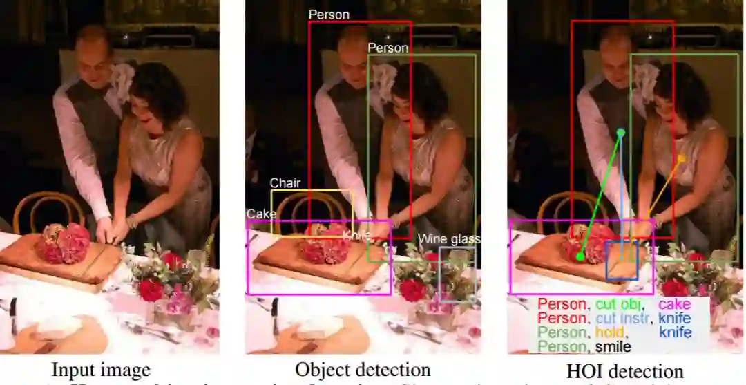 为何是 HOI?检测和识别 HOI 是朝着更深入理解场景迈出的重要一步。而不是“哪里有什么?”(即,在图像中定位物体实例),HOI 检测的目标是回答“发生了什么?”的问题。研究 HOI 检测问题也为其他相关的高级视觉任务提供了重要线索,例如姿态估计 [2,40],图像标注 [24,39] 和图像检索 [21]。
