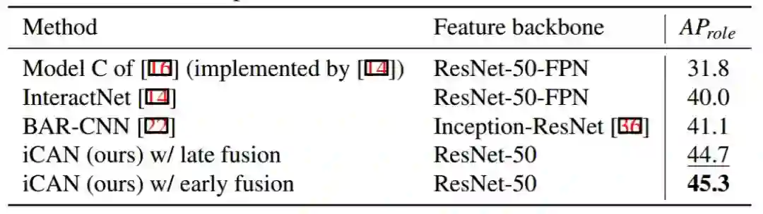 表 1:在 V-COCO 测试集上与当前最佳模型的性能比较。