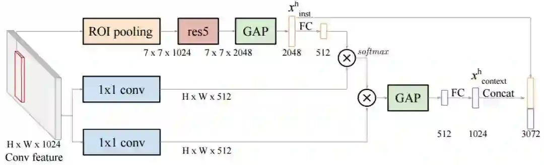 图 4:iCAN 模块。给定图像的卷积特征(以灰色显示)和人/物体边界框(以红色显示),iCAN 模块提取实例