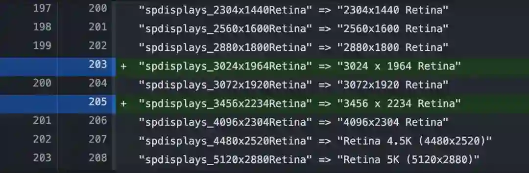 本周早些时候发布的macOS Monterey Beta 7,在System Information应用的显示分辨率列表中包括了两个新的条目,疑似曝光了即将推出的“M1X”14英寸和16英寸MacBook Pro机型的分辨率。MacRumors发现,这两款新的显示屏分辨率分别为“3456 x 2234 Retina”和“3024 x 1964 Retina”,与当前或以前任何苹果产品的内置显示屏分辨率都不相符。根据这些分辨率本身以及它们之间的关系,这些新的分辨率似乎是针对即将推出的MacBook Pro的。目前16英寸的MacBook Pro的原生显示分辨率为3072 x 1920,而目前13英寸的MacBook Pro的原生分辨率为2560 x 1600,这两款机器的像素密度都在226-227像素/英寸之间。 如果这些新分辨率确实适用于即将推出的MacBook Pro机型,那么像素密度将提高到250左右,这显然将允许将原生2x Retina作为这些新机器的默认设置,以获得尽可能清晰的图像。 虽然用户有多个显示分辨率选项可供选择,但目前的MacBook Pro机型具有可缩放的默认分辨率,介于原生显示分辨率和2倍Retina显示屏之间。 例如,目前的16英寸MacBook Pro的原生分辨率为3072 x 1920,相当于1536 x 960的真正视网膜质量,但这种16英寸对角线的显示屏上的内容对大多数用户来说似乎太大了,所以苹果出厂时默认的缩放分辨率“看起来”像1792 x 1120。随着像素密度明显增加,真正的2x Retina设置对于大多数用户来说恰到好处,16英寸机型的分辨率为1728x1117,14英寸机型的分辨率为1512x982。