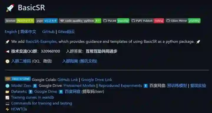 Gitee码云地址:https://gitee.com/xinntao/BasicSR