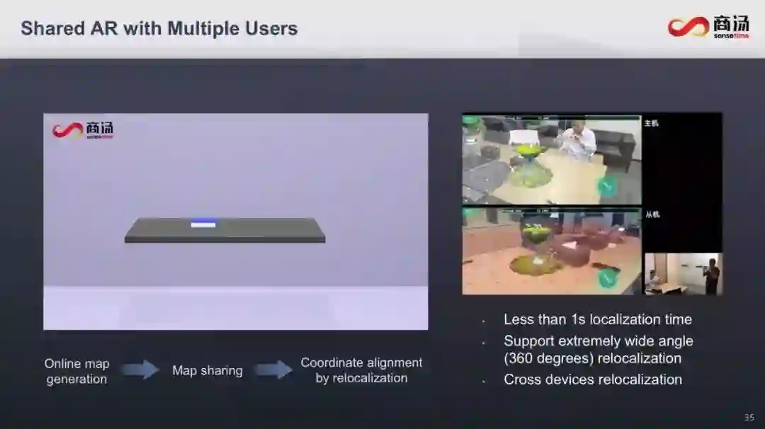 作为AR中的关键技术,商汤在SLAM上也投入了大量的资源,而且与当前的传统方案相比,不仅效率更高,而且也更加稳定。他也给出了相应的数据,在支撑多人AR游戏的时候,定位时间少于1秒。