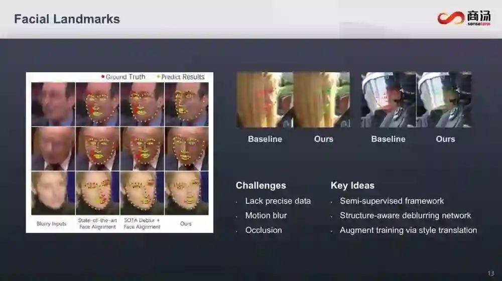 对于这些挑战,汤教授也都介绍了相应的解决思路:可以通过虹膜轮廓特征点和耳朵特征点,来补充特征点。至于缺乏数据以及遮挡、运动模糊等情况,可以用半监督框架、结构感知的去模糊网络等方式来解决。