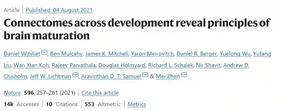 线虫神经系统的3D模型。线虫只有302个神经元,因此它是第一个(也是迄今为止唯一的)可以编译出完整、详细的连接组的动物。科学家将复杂的交配行为分解为寻找伴侣、交配和休息等子类。然后将神经元活动映射到蠕虫的连接组上,以识别在交配过程中处理环境信息的大脑机制。据该研究论文的第一作者、神经科学家Vladislav Susoy介绍,由此产生的大脑活动图在研究中使用的8种蠕虫之间显示出高度一致,以至于可以用来预测第9种蠕虫的行为。因此,科学家们决定通过实验来检验这个预测。以一种新的蠕虫为例,他们精确地移除了这种蠕虫与「转动」有关的五个神经元中的一个,结果,蠕虫果然失去了转动的能力。 Susoy说:「这种联系如此清晰,真是令人惊讶。」研究斑马鱼大脑的哈佛大学神经科学家Florian Engert称,这篇论文是该领域的「里程碑」,因为它使用连接组来考察复杂的行为。他表示,连接组正在成为一种关键资源。「它可以作为研究神经元回路如何运作的工具和数据库。」恩格特实验室的神经科学家和博士后研究员Gregor Schuhknecht说。不过,除了解释动物行为的基础之外,连接组学研究还可以揭示关于这些行为如何连接到大脑的微妙细节。Lichtman表示,大脑可以用无数种方式做事。我的猜测是,在几乎所有情况下,大脑神经系统很少采用最简单的路径,因为它的设计并不简单。例如,一段时间以来人们都知道,对线虫而言,幼虫和成虫的神经元之间的连接形式是明显不同的。为了了解大脑整个发育过程中的变化。 在最近《自然》上的一篇文章中,Lichtman,Samuel and Mei Zhen等研究人员比较了八个基因完全相同的蛔虫幼虫和成虫之间神经元连接方式的差异。根据论文第一作者Daniel Witvliet的说法,这项研究最有趣的发现是,尽管这些蠕虫在基因上是相同的,但它们大脑中神经细胞之间的连接有多达40%是不同的。这一发现表明了对大量大脑链接图进行比较的重要性。「你不能只是说,'我们已经绘制了蠕虫连接组图',因为每个连接组都是略有不同的。」Witvliet说。Lichtman说,这一发现表明存在两类连接:可变的连接和一致的连接。如果事实证明,动物需要建立更一致的连接,来支持生存所必需的神经活动,那么他认为,一些连接的变化程度可能成为连接组中重要特征的标志。「如果可以比较多个连接组,就可能看出特征上的重要差异,而不是完全随机的。」Lichtman说。 他表示,在未来,连接组学能定期分析多个个体的大脑,比较健康和不健康的动物、年轻和年老的动物等等。「我认为,一旦绘制大脑神经连接图成为平常之事,这很可能会成为现实。」