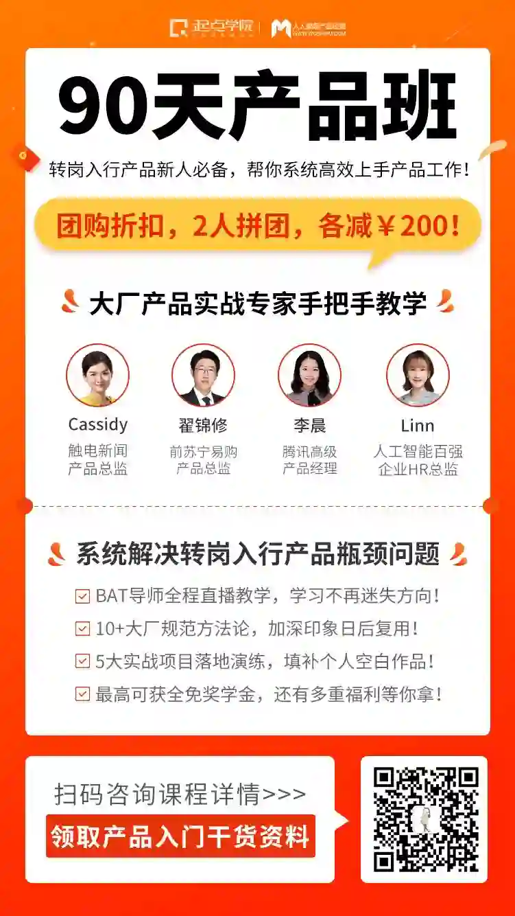 这里向大家推荐起点学院联合腾讯课堂创办的产品入门课程「90天产品经理实战班」。一线大厂导师带你系统学习产品知识核心板块,从0到1体验产品实战的全流程,掌握规范文档输出能力,达到产品岗位的用人要求!