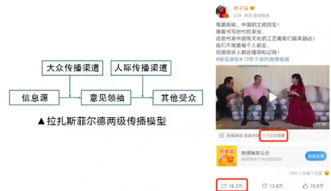 信息源:李子柒的视频、文案、图片、观点等通过大众媒介传播(一级传播播放次数2000万次以上)。