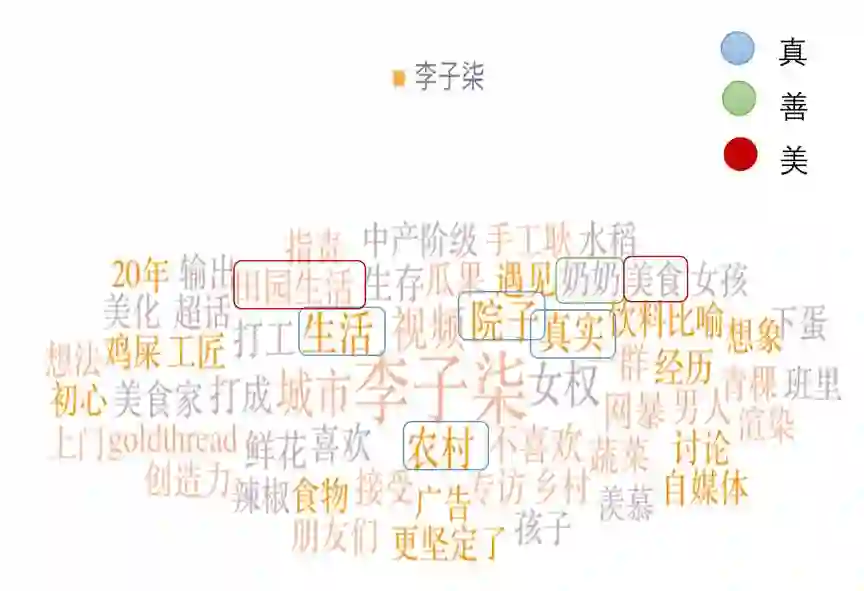 从以下关联词云可以看出李子柒的作品所引发的情感可以概括为“真善美”,“农村、生活、真实、院子”可以看出情感内涵是真,“奶奶”的情感内涵是善,“田园生活、美食”的情感内涵是美。