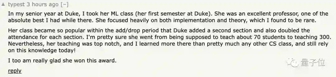 获奖消息公布后,很多她的学生都在网络上表示祝贺,说上学时候她的课很受欢迎,并且理论和应用同样受重视的课程并不多见。