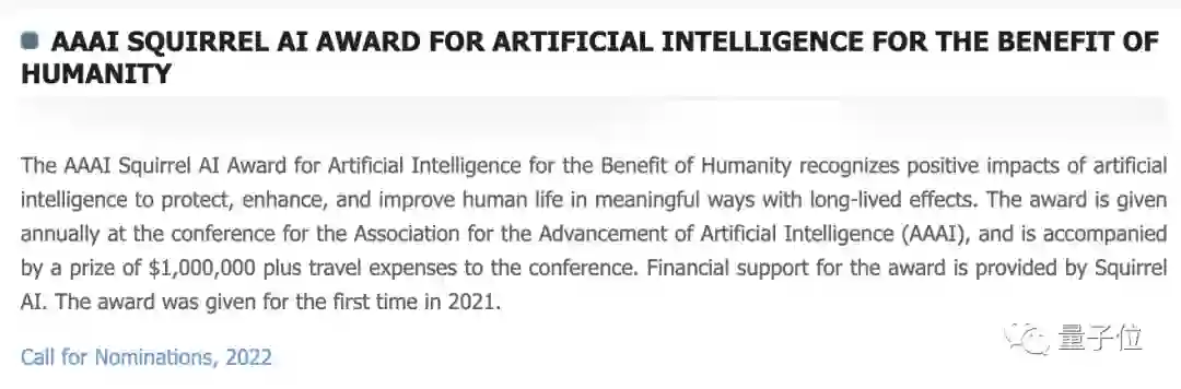 该奖项由AAAI和松鼠AI联合颁发,全称为“人工智能人类福祉奖”,也被称为”AI界的诺贝尔奖”。