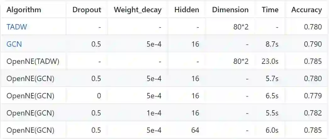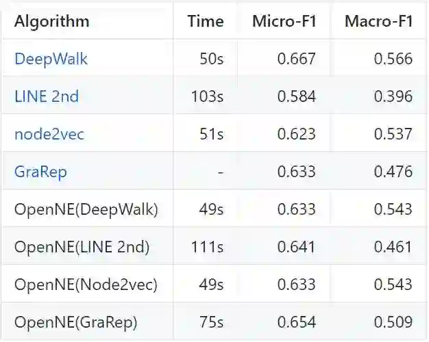 为了方便大家对网络表示学习(NE/NRL)开展相关的实验或研究,清华大学计算机科学与技术系的研究人员在 GitHub 上发布了 NE/NRL 训练和测试框架 OpenNE,其中统一了 NE 模型输入/输出/评测接口,并且修订和复现了目前比较经典的网络表征学习模型。该项目还在持续开发中,作者还提供了与未扩展模型的比较结果。
