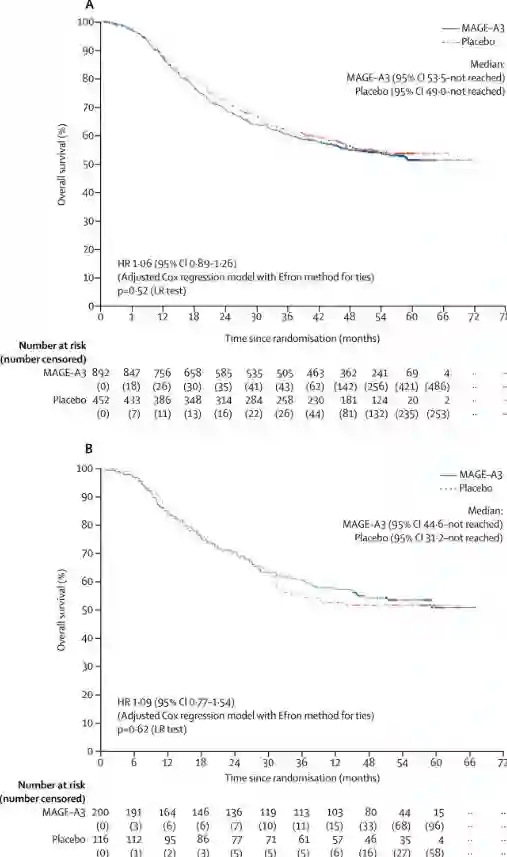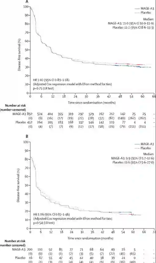 在无病生存率方面,MAGE-A3免疫治疗组的1年、2年、3年和4年数据分别为47%, 37%, 33%,和31%,而安慰剂组的此项数据则分别为47%, 39%, 35%, 和33%。