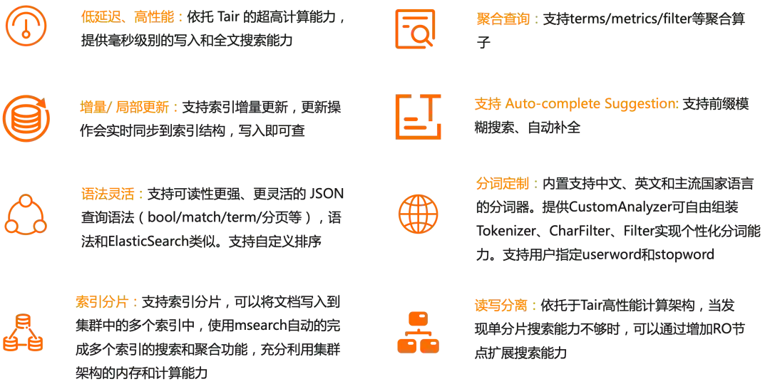 TairSearch 是Tair自主研发的高性能、低延时、基于内存的实时搜索特性,不但增强了 Tair 在实时计算领域的能力,还和现有的其他数据结构一起为用户提供一站式的数据解决方案。Tair采用了和 ElasticSearch(下文称之为ES)相似的基于 JSON 的查询语法,满足了灵活性的同时还兼容ES用户的使用习惯。Tair 除了支持 ES 常用的分词器,还新增JIEBA 和 IK 中文分词器,对中文分词更加友好。Tair支持丰富的查询语义和聚合能力,并且支持索引实时更新和局部更新。Tair 可以通过 msearch 方案实现索引的分片和搜索能力,并通过读写分离架构实现搜索性能的水平扩展。