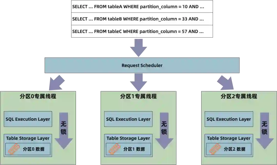 在提升单机引擎的并发上,SQL 场景使用了另外一种解法,让每一个 Partition 的数据由一个单独的线程来进行处理,这样能在引擎内部通过增加分区达到线性的扩展,而且无需使用前面提到的无锁实现中常会使用的重试步骤。相对于上面的方案,这种方案的工程难度更低,且能够天然地支持 Serializable 的事务隔离级别,某一特定时刻只有一个事务能够运行在特定的分区上,增加 undo buffer 即可以保证事务的原子性。