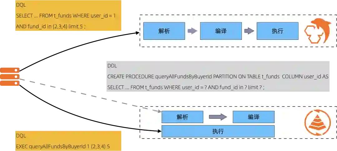 经典的 NoSQL 系统,提供的 API 都是和服务端的处理流程非常耦合的,比如说 Redis 提供了很多 API,光是 List 就有 20 多个接口。在服务端其实很多接口的执行过程中的步骤是比较类似的,比如说有一些 GenericXXX 的函数定义。我们再看看一般的 RDBMS 中的处理 SQL 的流程,一般是 解析(从 SQL 文本到 AST),然后是优化器编译 (把 AST 编译成算子,TableScan、Filter、Aggregate),然后是执行器来执行。类比到 Redis 中,用户传进来的就是 AST,且服务端已经预定了执行计划,直接执行就行了。如果我想使用 SQL,不想学习这么多 API,同时由于我的访问场景是比较固定的,比如进行模板化之后,只有十多种 SQL 语句,且访问的数据比较均衡,某一条特定的语句所有的参数用一条特定的索引就足够了,有没有办法在执行过程中省去解析、编译的开销来提高运行的效率?有很多同学可能已经想到了存储过程。是的,存储过程很多场景是在扩充表达能力,比如多条语句组成的存储过程,需要进行比较复杂的逻辑判断,单条语句存储过程本质上是在灵活性和性能上进行折衷。Tair 所有线上运行的 SQL 都是预先创建存储过程的,这样进行访问就类似于调用 Redis 的一个 API 了,这是在复杂计算逻辑的场景下保证低延时的一种方案。