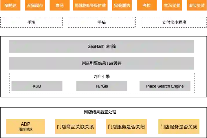 新一代判店系统,依托 Tair 的 Gis 能力,底层使用 RTree 结构,支持常见的 Contains, Within, Intersects 等关系判断,可以在 ms 级别返回查询数据,目前已经在淘菜菜、天猫超市、淘鲜达、盒马、同城购等多个业务使用。