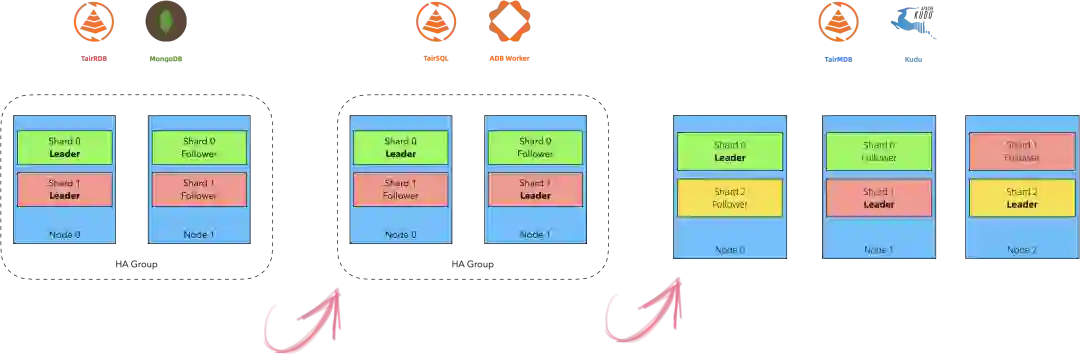 对于节点失效,涉及到判活和后续的数据处理两类的问题。对于很多系统而言,冗余和分片是分开的,比如 Redis Cluster、MongoDB、AnalyticDB Worker,即有一个 HA Group 的概念,HA Group 中的每一个节点,数据是完全一致的。不同系统处理的时候依然会有些区别,一些系统 HA Group 中的某一个节点所有分区都是 Leader,我们称为 Leader 节点,提供读写服务,其它节点只有冗余数据的同步流量,称为 Follower 节点,比如 Redis Cluster,这类系统在调度系统不够成熟的时期,有一个明显的短板就是 Follower 节点所在的机器资源是有空余的,通常是通过朴素的混布来提供资源的利用率,但也带来了部署上的复杂度,所以在系统设计的时候就会有这样的考量:能不能在 HA Group内分散这些分区的 Leader 呢,于是就有了下面这些系统。一些系统 HA Group 的每一个节点都承担部分分区的 Leader,这就是每个节点都会提供读写服务,比如 AnalyticDB Worker。这类有 HA Group 的系统,判活和后续数据处理一般只在 HA Group 内,即某个节点失效后,会把访问流量转移到 HA Group 内的其它节点,然后通过上层的调度在 HA Group 内补充新的节点。还是老问题,在调度系统还不够成熟的时期,补充新的节点也会带来运维的复杂度,那就会有新的考量:能不能跨越 HA Group 的限制,把冗余的个数和系统内节点的个数解耦呢?于是就有了 Kudu 这类系统的架构,冗余和分片是交织起来的,某一个节点失效之后,它上面的分区会由中心节点来调度到其它节点。在调度能力非常成熟的今天,数据库系统自身的能力怎么和数据库相关的调度能力想结合,也会给系统架构带来新的启发。
