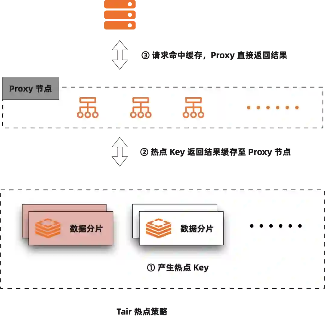 热点访问是商品维度、卖家维度的数据常常会遇到的一个挑战,热点方案也是 Tair 能够服务于低延时场景的关键能力。前面讲了水平扩展之后,用户的某个请求就会根据一定的规则(Hash、Range、List 等)路由到某一个分区上,如果存在热点访问,就会造成这一个分区的访问拥塞。处理热点有很多方案,比如二级散列,这种方案对于热点的读写可以做进一步拆分的场景是有用的,比如现在我们有一个卖家订单表,然后卖家 id 是分区列,则我们可以再以订单 id 做一次二级散列,解决一个大卖家导致的热点问题;目前淘宝大规模使用的 Tair 的 KV 引擎不满足使用二级散列的前提,一般来说商品的信息映射到 Tair 内就是某一个 Value,更新和读取都是原子的。所以 Tair 目前使用的方案是在一层进行散列,借助于和客户端的交互,将热点数据分散到集群当中的其它节点,共同来处理这个热点请求,当然这种方案需要应用接受热点在一定时间内的延迟更新。另外这种方案需要客户端和服务端协同,需要应用升级到对应的客户端才能使用。所以最新的 Tair 热点策略在兼容社区 Redis 的服务时使用了不同的方案,应用能够直接使用任一流行的开源客户端进行访问,因此需要在服务端提供独立的热点处理能力。目前的 Tair 热点能力是由 Proxy 来提供的,相对于 Tair 之前的方案,这种方案拥有更强大的弹性和更好的通用性。