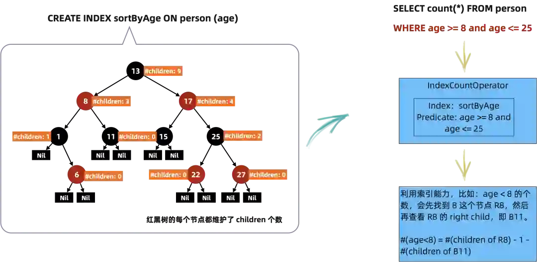 在数据库系统中,索引能力的增强还可以让执行器对外暴露更强的算子,比如 Tair 中的 RBTree 提供了快速计算两个值之间 Count 的能力,对外提供了