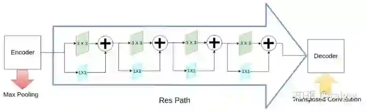 该网络除了MultiRes模块以外,还提出了一个残差路径(ResPath), 使编码器的特征在与解码器中的对应特征拼接之前,先进行了一些额外的卷积操作,如下图所示。作者认为编码器中的特征由于卷积层数较浅,是低层次的特征,而解码器中对应的特征由于卷积层更深,是较高层次的特征,二者在语义上有较大差距,推测不宜直接将二者进行拼接。因此,使用额外的ResPath使二者在拼接前具有一致的深度,在ResPath1, 2, 3, 4中分别使用4,3,2,1个卷积层。