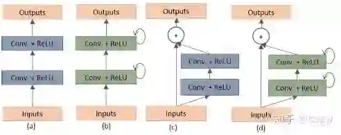 其中环形箭头表示循环连接。下图表示了几种不同的子模块内部结构图,(a)是常规的U-Net中使用的方法,(b)是在(a)的基础上循环使用包含激活函数的卷积层,(c)是使用残差连接的方式,(d)是该文章提出的结合(b)和(c)的循环残差卷积模块。