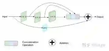MultiResUNet[8]提出了一个MutiRes模块与UNet结合。MutiRes模块如下图所示,是一个残差连接的扩展,在该模块中三个3x3的卷积结果拼接起来作为一个组合的特征图,再与输入特征图经过1x1卷积得到的结果相加。